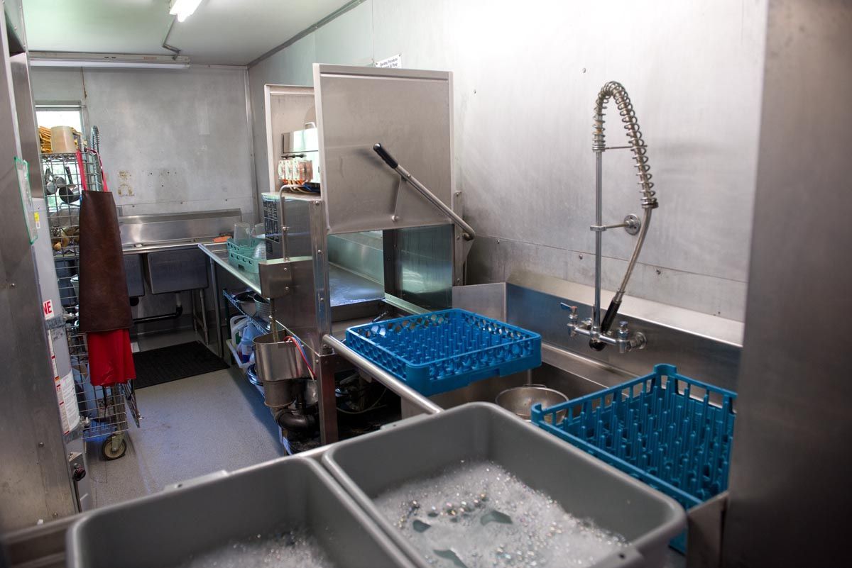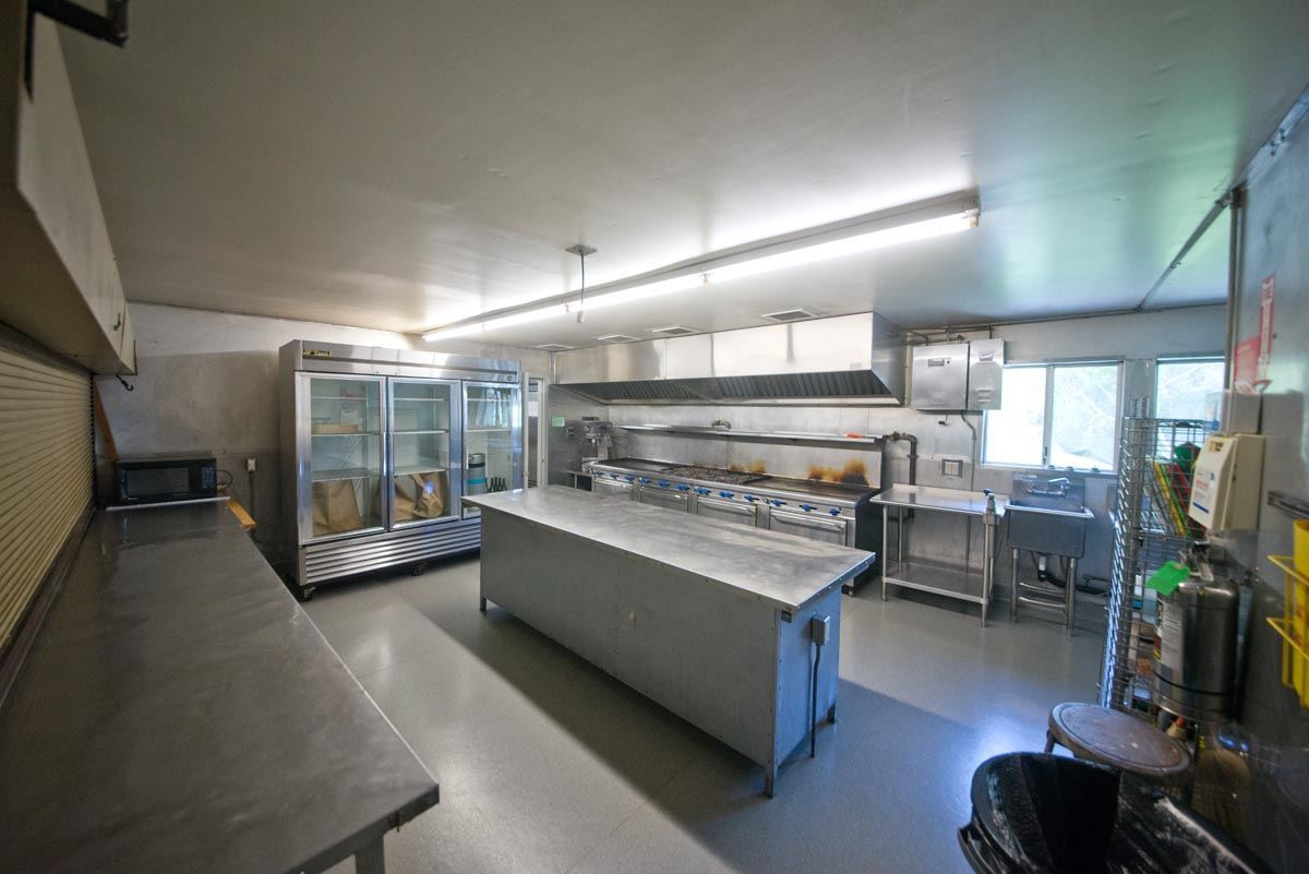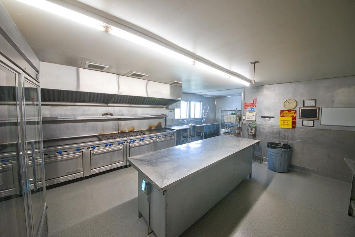 The well-lit commercial kitchen includes: